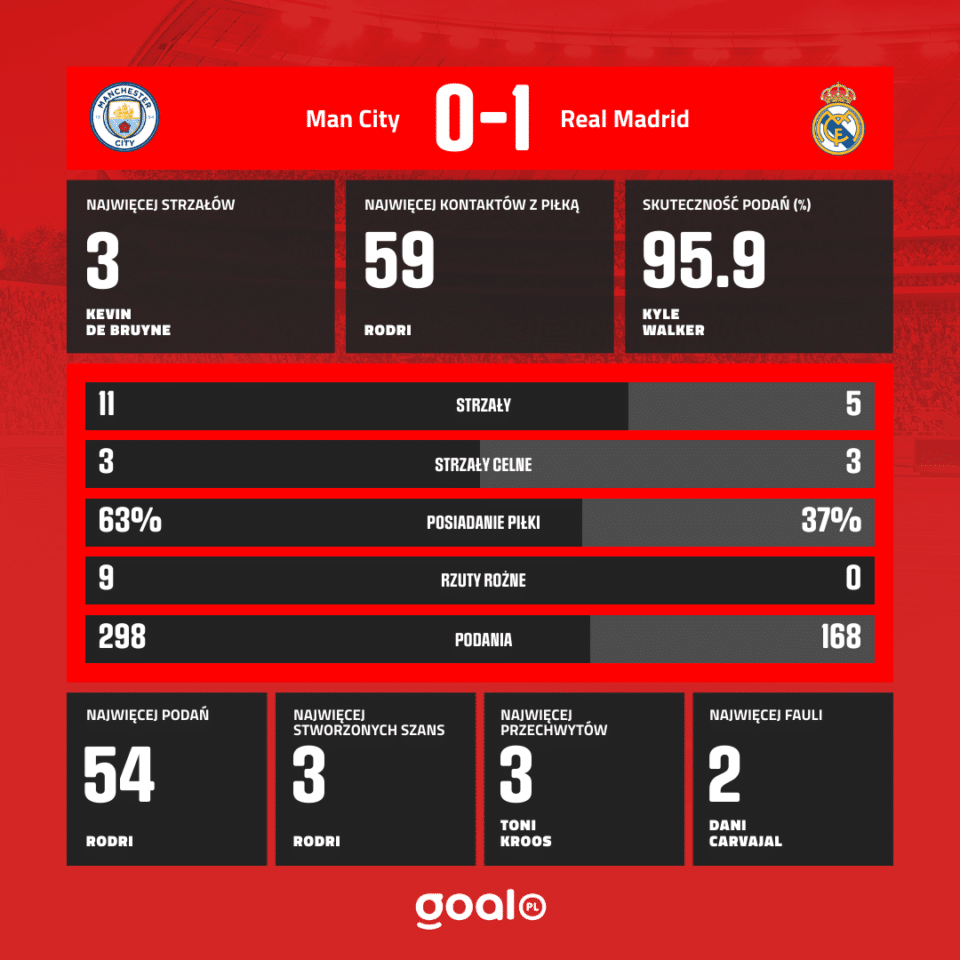 Real Madryt miał okazje stworzyć zagrożenie pod bramką rywala po dobrze wyprowadzonej kontrze. Federico Valverde szukał w jedenastce Viniciusa, ale Ederson skutecznie wyszedł z bramki.
