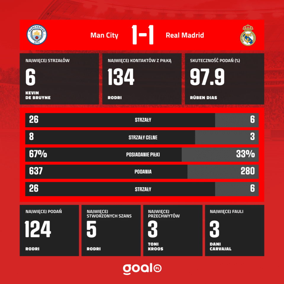 Już za równą godzinę rozpocznie się rewanżowy mecz Manchesteru City z Realem Madryt. W pierwszym meczu mieliśmy remis 3:3. Czyja dziś ręka powędruje ku górze?