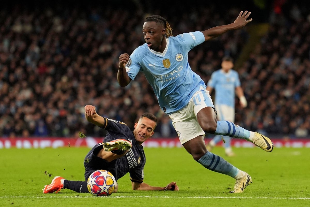 Jeremy Doku wszedł w pole karne, po tym jak pośliżgnął się Lucas Vazquez. Obrona Realu jednak stała w odpowiednim miejscu.