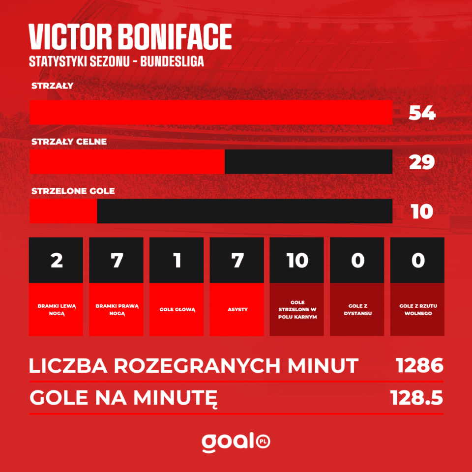 Victor Boniface w obecnie trwającej kampanii rozegrał 23 spotkania pod okiem Xabiego Alonso. W tym czasie udało mu się strzelić 16 goli oraz zaliczyć osiem asyst. Portal „Transfermarkt” wycenia nigeryjskiego napastnika na 40 milionów euro.