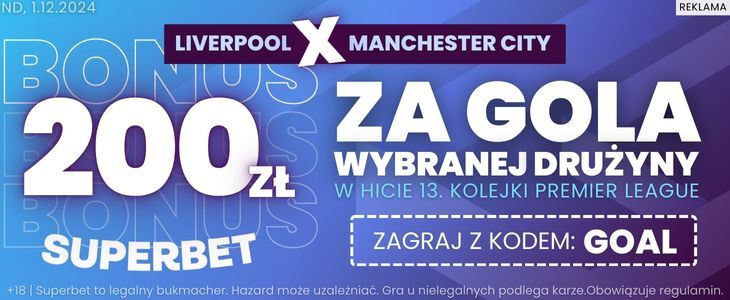 Liverpool jest pewnym liderem Premier League, a Manchester City, choć trudno uwierzyć, to przegrał cztery ostatnie ligowe mecze. Czy „The Reds” znów pokażą klasę, a może to „Obywatele” się przełamią? Superbet proponuje bonus za poprawny typ na gola wybranej drużyny. To 200 złotych po rejestracji ze specjalnym kodem bonusowym o treści: GOAL.