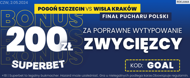 W czwartek (2 maja) Pogoń Szczecin zmierzy się z Wisłą Kraków w finale Pucharu Polski. Bukmacher Superbet oferuje bonus 200 zł za wskazanie zwycięzcy.