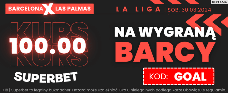 Na nadchodzące spotkanie Barcy jeden z bukmacherów przygotował specjalną promocję. Rejestrując się w Superbet z kodem GOAL, można obstawić kupon na zwycięstwo FC Barcelony z Las Palmas po kursie 100.00. Stawiając zaledwie 2 zł, można otrzymać freebet o wartości 200 zł. Żeby skorzystać z promocji, wystarczy wykonać kilka prostych kroków, o których wspominamy poniżej.