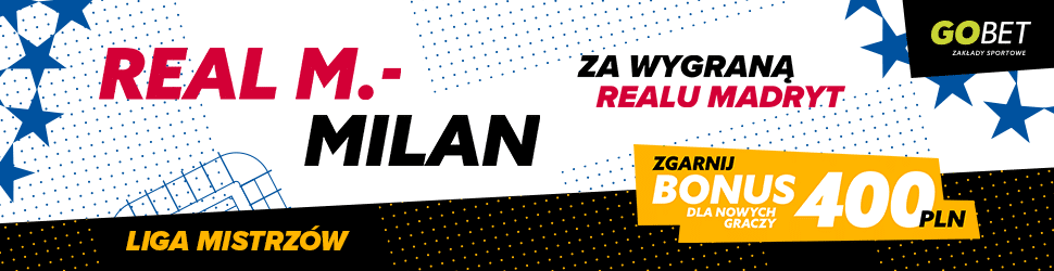 Jednym z ciekawszych meczów w 4. kolejce Ligi Mistrzów będzie wspomniany już pojedynek Realu Madryt z AC Milan. Jeżeli wierzysz w triumf faworyzowanych „Królewskich”, to ciekawą promocję przygotował bukmacher Go+bet. Jest to bowiem 400 złotych bonusu właśnie za taki typ. Ofertę aktywujesz z kodem promocyjnym: GOAL. Możesz go podać w trakcie rejestracji bądź kliknąć w dowolny link w moim tekście, co spowoduje jego automatyczną aktywację.