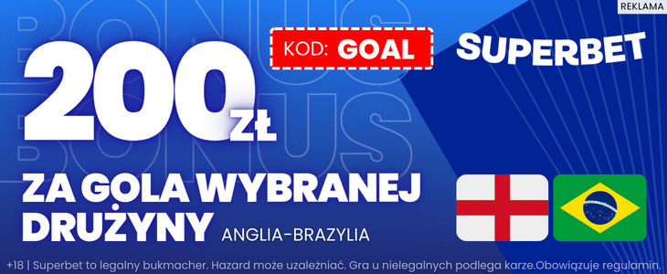 - W Superbet możesz zagrać kupon na gola Anglii lub Brazylii po kursie 100.00