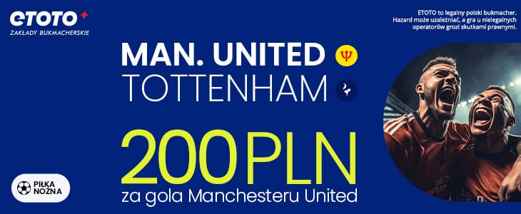 Świetną ofertę na mecz Manchesteru United z Tottenhamem przygotował bukmacher ETOTO. Wystarczy założyć konto, wykorzystując kod promocyjny ETOTO GOAL, żeby otrzymać możliwość obstawienia gola Czerwonych Diabłów po kursie 200.00. Poniżej wyjaśniamy krok po kroku jak skorzystać z oferty. Z naszym kodem dodatkowo można liczyć na łączny bonus powitalny do 2222 zł i freebet 20 zł.