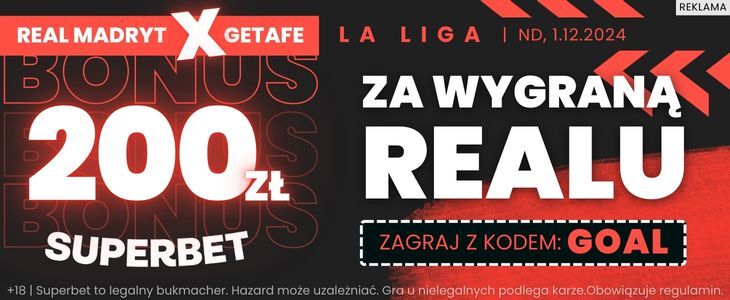 Jak skorzystać z opisanego bonusu? Zarejestruj się w Superbet z kodem GOAL lub aktywuj kod, klikając w ten link. Musisz też zatwierdzić obie zgody marketingowe oraz wpłacić minimum 50 złotych. Ostatni krok to wysłanie zakładu przedmeczowego za minimum 2 złote na zwycięstwo Realu Madryt z Getafe w 15. kolejce La Liga.