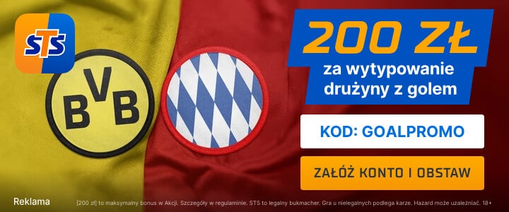 Der Klassiker to mecz, którym żyją fani Bundesligi. Czy Borussia Dortmund będzie w stanie ograć niepokonany w tym sezonie ligowym Bayern Monachium? Przed meczem pytań jest więcej, niż odpowiedzi, a emocje podkręca STS. Ten bukmacher proponuje bowiem 200 złotych bonusu za wytypowanie drużyny, która strzeli gola. Promocja jest dostępna ze specjalnym kodem o treści GOALPROMO. Poniżej sprawdzisz pozostałe warunki.