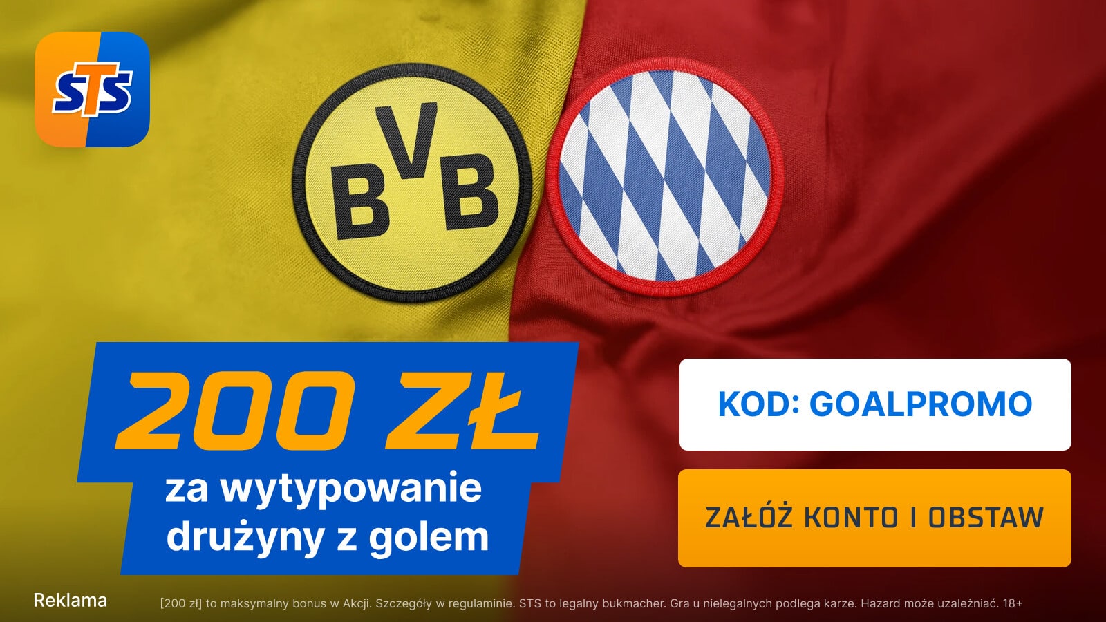 Der Klassiker to mecz, którym żyją fani Bundesligi. Czy Borussia Dortmund będzie w stanie ograć niepokonany w tym sezonie ligowym Bayern Monachium? Przed meczem pytań jest więcej, niż odpowiedzi, a emocje podkręca STS. Ten bukmacher proponuje bowiem 200 złotych bonusu za wytypowanie drużyny, która strzeli gola. Promocja jest dostępna ze specjalnym kodem o treści GOALPROMO. Poniżej sprawdzisz pozostałe warunki.