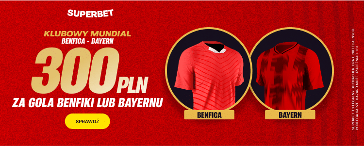 Benfica Lizbona zagra z Bayernem Monachium w spotkaniu 3. kolejki fazy grupowej Klubowych Mistrzostw Świata. Mecz odbędzie się 24 czerwca 2025 roku o 21:00. Superbet stworzył atrakcyjną promocję dla nowych graczy, w której można zgarnąć bonus 300 PLN za poprawne wytypowanie gola jednej z tych drużyn.