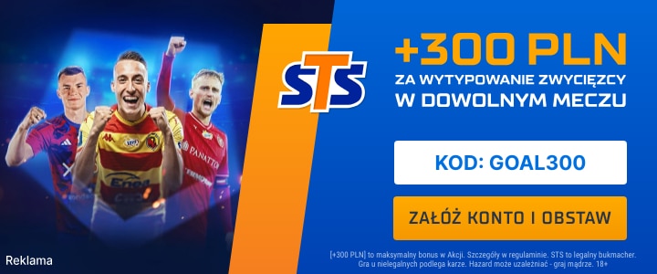 Jeżeli chcesz skorzystać z opisywanego w tekście bonusu, zarejestruj swoje konto w STS z kodem promocyjnym GOAL300 i spełnij pozostałe warunki promocji, a więc: akceptacja obu zgód marketingowych, wpłata min. 50 złotych i postawienie za min. 2 złote pierwszego kuponu (SOLO lub AKO), zawierającego typ na zwycięzcę dowolnego meczu 4. kolejki Ekstraklasy lub 1. Ligi.