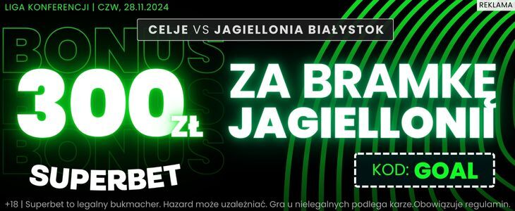 Jak wypadnie Jagiellonia Białystok w wyjazdowym meczu przeciwko NK Celje? Możesz postawić zakład na gola mistrzów Polski, a jeśli trafisz, to odebrać 300 złotych bonusu od bukmachera Superbet. Niezbędna w tym celu jest rejestracja konta ze specjalnym kodem promocyjnym o treści: GOAL. W tekście sprawdzisz także pozostałe warunki.