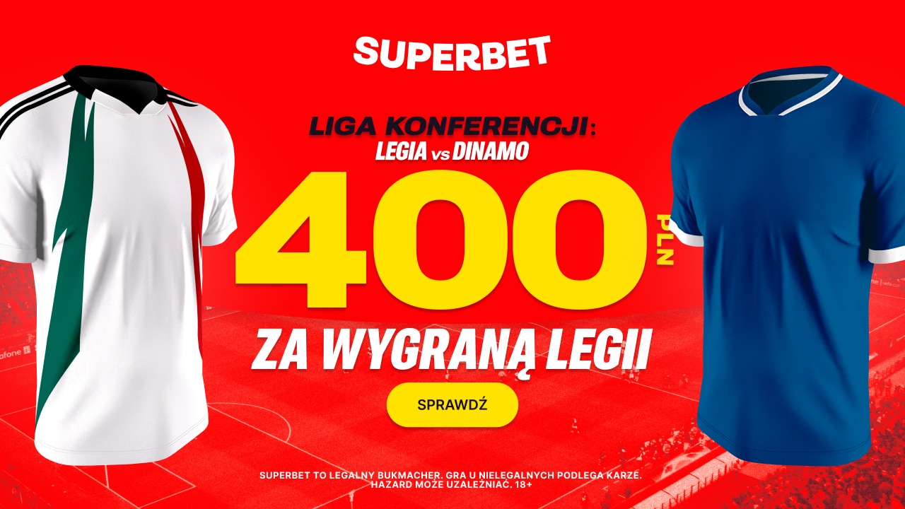 Trzeci mecz i trzecie zwycięstwo Legii Warszawa w Lidze Konferencji Europy? Jeżeli podzielasz moje zdanie, to możesz obstawić takie rozstrzygnięcie w Superbet. Jeśli trafisz, bukmacher nagrodzi Cię bonusem o wartości 400 złotych. Pamiętaj, aby założyć konto z kodem promocyjnym o treści: GOAL, co jest niezbędne w celu skorzystania z opisywanej promocji.