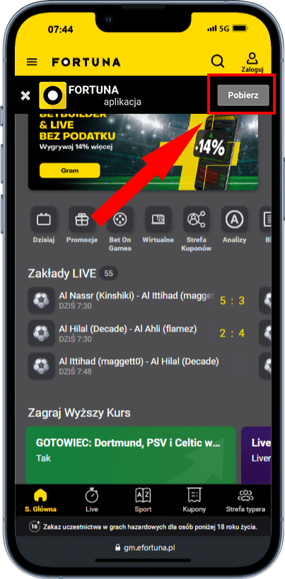 - Na stronie bukmachera Fortuna kliknij „Pobierz” w miejscu zaznaczonym na poniższym screenie