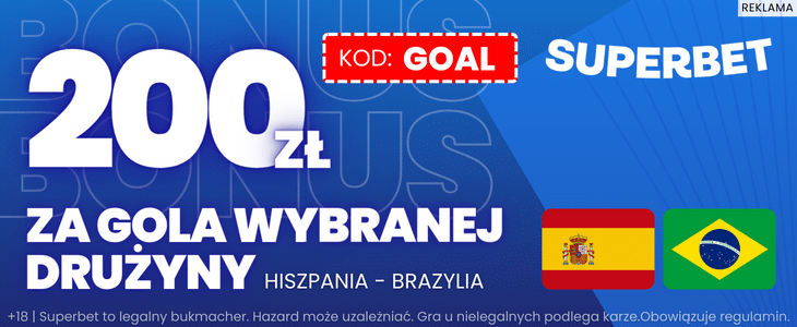 - W Superbet możesz zagrać kupon na gola Hiszpanii lub Brazylii po kursie 100.00