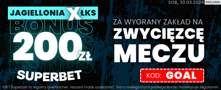 Superbet na nadchodzące spotkanie Ekstraklasy przygotował specjalną promocję. Zakładając konto w Superbet z kodem GOAL, można obstawić kupon na zwycięzcę meczu Jagiellonia – ŁKS po kursie 100.00. Stawiając zaledwie 2 zł, można otrzymać freebet o wartości 200 zł. Żeby skorzystać z promocji, wystarczy wykonać kilka prostych kroków, o których wspominamy poniżej.