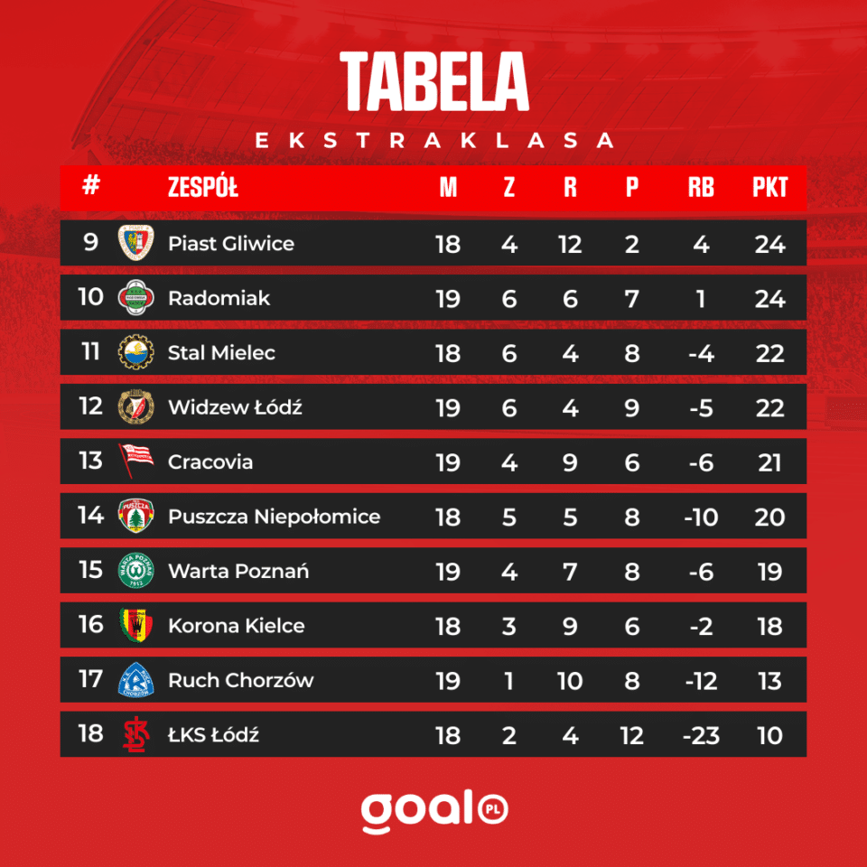 Już w piątek (9 lutego) do gry wróci PKO BP Ekstraklasa. Pierwsza część sezonu wyłoniła grono drużyn, które będą musiały martwić się o utrzymanie. W zdecydowanie najgorszej sytuacji są ekipy ŁKS-u Łódź i Ruchu Chorzów. Ponadto w walkę o byt na najwyższym poziomie rozgrywkowym będzie zaangażowanych kilka innych zespołów, co jasno pokazuje aktualna tabela.