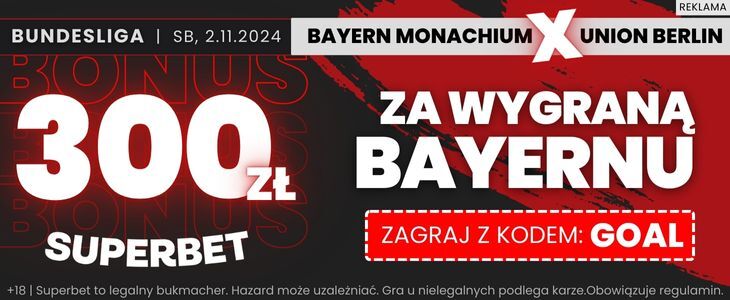 W ofercie Superbet pojawiła się specjalna promocja na sobotni bój w stolicy Bawarii. O 300 zł bonusu mogą ubiegać się wszyscy klienci, którzy uprzednio założą konto z kodem promocyjnym GOAL. Bukmacher wymaga również wykonania kilku dodatkowych czynności. Sprawdź, o czym dokładnie mowa.