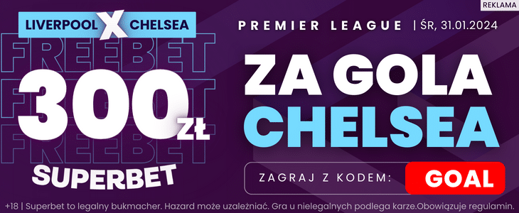 Ofensywna forma Liverpoolu może przestraszyć przyjezdnych. Jednak The Blues również pokazali swoją siłę, pokonując m.in. Middlesbrough 6:1 w Pucharze Anglii. Dlatego przynajmniej jeden gol Chelsea wydaje się wysoce prawdopodobnym zdarzeniem. Bukmacher Superbet na takie rozstrzygnięcie przygotował ciekawą promocję. Rejestrując się w Superbet z kodem GOAL, można zgarnąć bonus 250 zł za bramkę Chelsea z Liverpoolem.