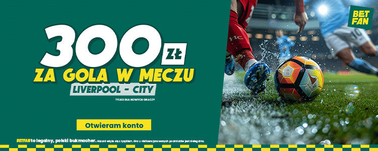 Z okazji meczu Liverpoolu z Manchestrem City bukmacher Betfan przygotował ciekawą promocję, w której do zdobycia jest freebet o wartości aż 300 zł za to, że w spotkaniu padnie przynajmniej jeden gol. Żeby móc skorzystać z oferty, wystarczy założyć konto i podczas rejestracji wpisać nasz kod promocyjny Betfan, którym jest GOAL. Dokładną instrukcję prezentujemy poniżej.