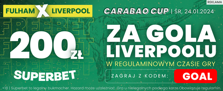 Specjalną promocję z okazji tego półfinału Carabao Cup przygotował Superbet. Bukmacher gwarantuje freebet o wartości 200 zł za bramkę Liverpoolu. W celu skorzystania z oferty należy podać podczas rejestracji kod promocyjny Superbet, który brzmi GOAL i umożliwia aktywację pakietu powitalnego 3775 zł + 600 zł.