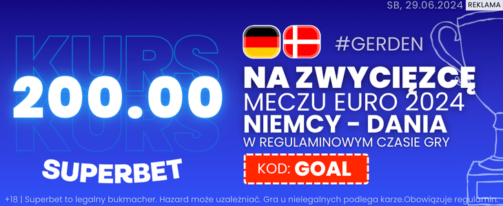 Na mecz 1/8 finału Euro 2024 Niemcy – Dania Superbet przygotował kurs 200.00, co wiąże się z możliwością otrzymania bonusu 400 złotych za wskazanie zwycięzcy. Oferta dotyczy wyłącznie nowych graczy, a do jej aktywacji niezbędna jest rejestracja z kodem promocyjnym Superbet, który brzmi: GOAL. Szczegółowe warunki omówiłem poniżej.