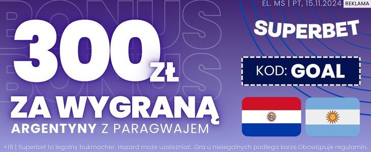 Argentyna chce umocnić się na czele wyścigu po awans do Mistrzostw Świata w 2026 roku. Czy wiesz, że możesz otrzymać 300 złotych bonusu za wytypowanie zwycięstwa „Albicelestes” z Paragwajem? Aby było to możliwe, musisz użyć kodu bonusowego GOAL przy rejestracji w Superbet. Możesz go wpisać do formularza lub kliknąć w poniższą grafikę, aby aktywować kod automatycznie.
