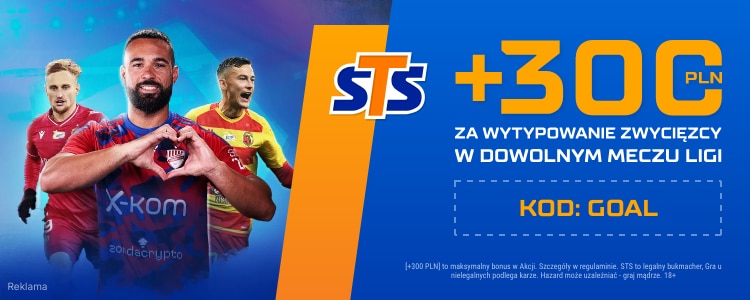 Z okazji powrotu Ekstraklasy ciekawą promocję przygotował STS, który oferuje bonus 300 zł za wytypowanie zwycięzcy dowolnego meczu 20. kolejki. Żeby skorzystać z oferty, wystarczy założyć konto w STS z kodem promocyjnym GOAL. Nasz kod gwarantuje także najlepszy bonus powitalny – aż do 1560 zł.