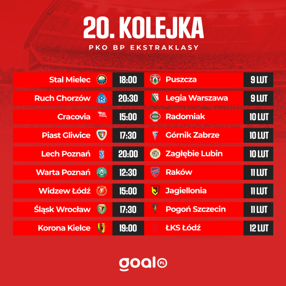 Początek 20. kolejki Ekstraklasy zaplanowano na piątek (9 lutego) o godzinie 18:00. Wówczas Stal Mielec podejmie u siebie Puszczę Niepołomice.