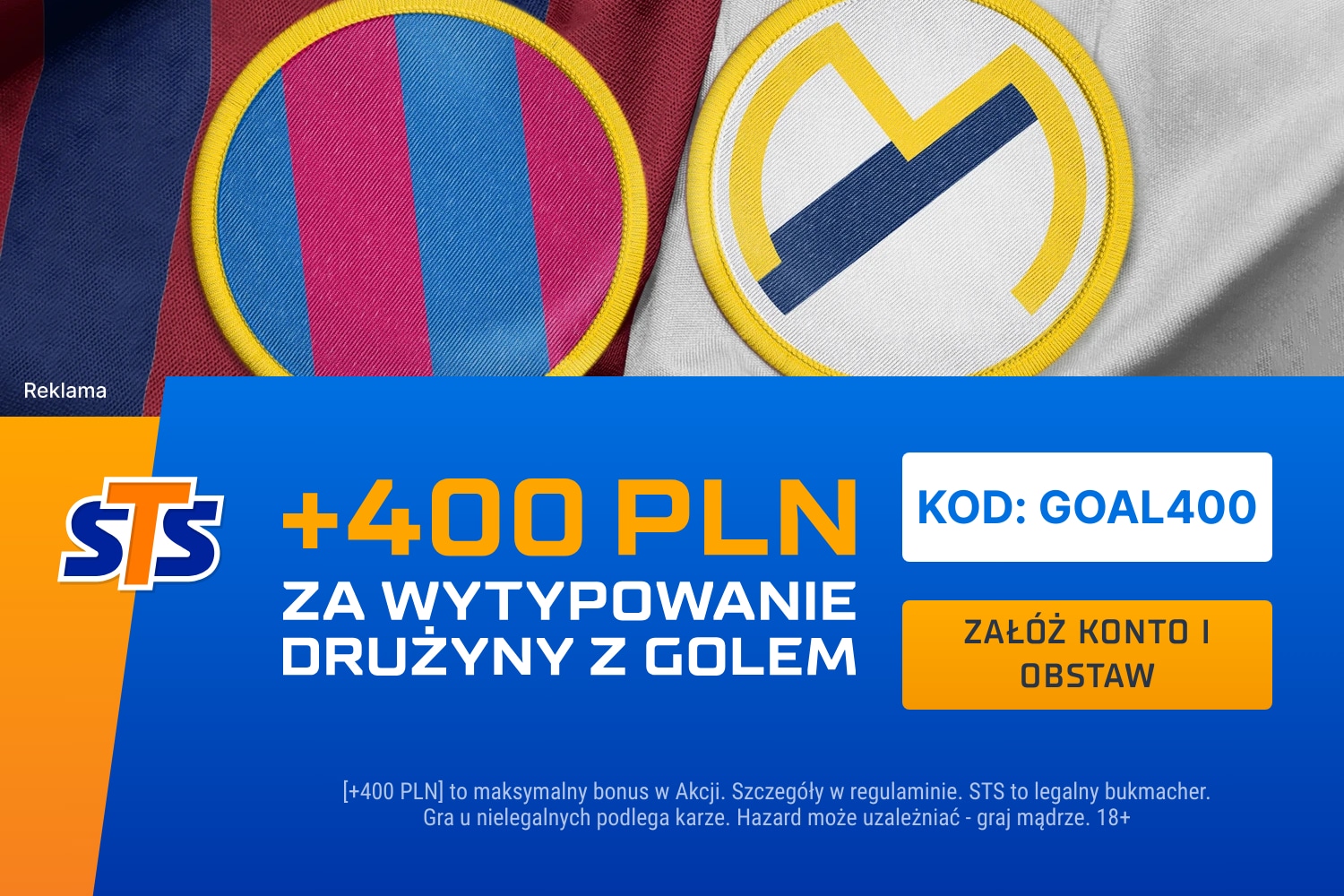 Bukmacher STS proponuje 400 złotych bonusu za wytypowanie drużyny, która strzeli gola w meczu Real Madryt – FC Barcelona. Jeżeli chcesz skorzystać z tej oferty, załóż konto z kodem promocyjnym GOAL400. Wymagane jest również potwierdzenie zgód marketingowych (sms oraz e-mail), wpłata minimum 50 złotych i wysłanie pierwszego kuponu (SOLO lub AKO) za minimum 2 złote, na którym znajdzie się typ na gola Realu Madryt lub FC Barcelony w przedsezonowym El Clasico.