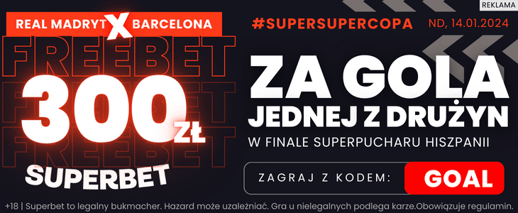 Superbet na finał Superpucharu Hiszpanii przygotował promocję, dzięki której można zgarnąć freebet o wartości aż 300 zł. Podając podczas rejestracji w Superbet kod promocyjny GOAL, otrzymasz możliwość obstawienia drużyny z golem po kursie 150.00. Wystarczy spełnić kilka prostych kroków, które wyjaśniamy poniżej.