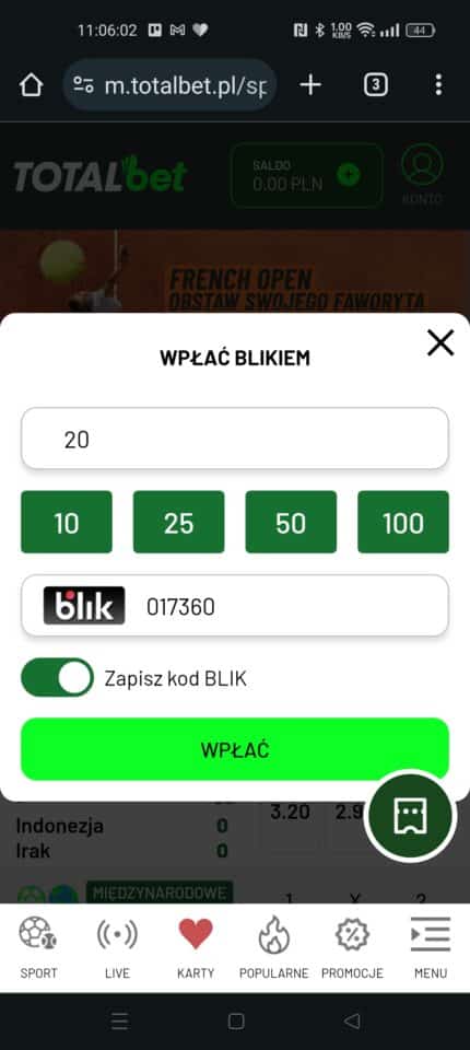 Dokonanie pierwszego depozytu w Totalbet nie sprawiło mi absolutnie żadnych problemów. Wykorzystałem opcję Blika poprzez Przelewy24, więc wystarczyło, że podałem kwotę, którą chciałem przelać na swoje konto bukmacherskie. Jako że na początku przygody z obstawianiem u tego bukmachera czekają was ciekawe bonusy, warto je uwzględnić przy ustalaniu kwoty 1. wpłaty.