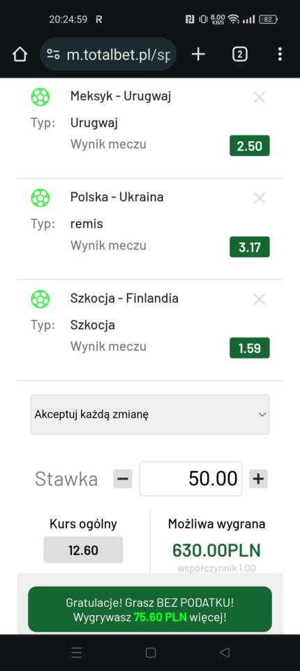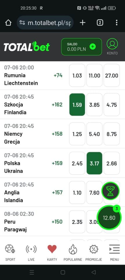 Muszę przyznać, że typowanie w Totalbet jest bardzo łatwe i nie miałem problemu w rozeznaniu się w ofercie bukmachera. Kiedy przeglądałem dostępne wydarzenia i kursy bukmacherskie, dostępne były głównie mecze towarzyskie drużyn narodowych przed zbliżającymi się turniejami. Wybrałem trzy z nich, żeby nie przesadzić i dobrałem stawkę do moich możliwości finansowych. Totalbet od razu poinformował mnie, o ile więcej mogę wygrać, grając u tego bukmachera bez podatku, co stanowi ciekawe urozmaicenie.