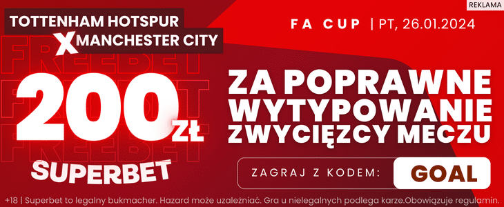 Na spotkanie Tottenhamu z Man City w ramach 1/16 finału Pucharu Anglii ciekawą ofertę przygotował Superbet. Bukmacher oferuje freebet o wartości 200 zł za wytypowanie zwycięzcy. Z promocji będzie mógł skorzystać każdy gracz, który zarejestruje się w Superbet z naszym kodem promocyjnym GOAL.