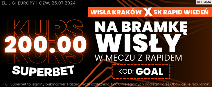 Bonus 400 zł można zgarnąć za to, że Wisła Kraków zdobędzie przynajmniej jednego gola. Żeby skorzystać z promocji, należy zarejestrować się w Superbet z kodem promocyjnym GOAL.