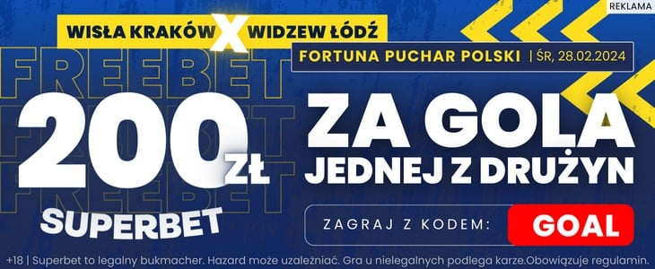 Przy okazji tego spotkania warto zwrócić uwagę na świetną ofertę przygotowaną przez Superbet. Podając podczas rejestracji w Superbet kod promocyjny GOAL otrzymasz możliwość postawienia zakładu na choćby jednego gola Wisły lub Widzewa po kursie 100.00. Dzięki tej ofercie, stawiając tylko 2 zł, na Twoje konto może trafić freebet w wysokości 200 zł. Jak skorzystać z oferty? To bardzo proste. Wyjaśniam to krok po kroku poniżej.
