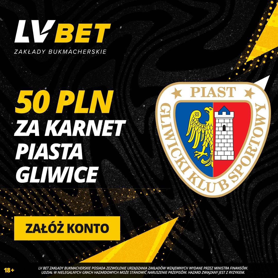 Jesteś fanem Piasta Gliwice? LV BET, jako oficjalny sponsor klubu, przygotował dla Ciebie wspaniałą promocję. Każdy posiadacz karnetu na sezon 2024 / 2025 Ekstraklasy może otrzymać 50 zł jako bonus na zakłady! Wystarczy, że przygotujesz kopię swojego karnetu, na którym widnieją Twoje imię, nazwisko oraz numer karnetu. Następnie prześlij zdjęcie na adres promocje@lvbet.pl, wpisując w tytule wiadomości „Karnet Piast Gliwice”. Po weryfikacji, w ciągu 48 godzin bonus 50 zł zostanie automatycznie dodany do Twojego konta LV BET.