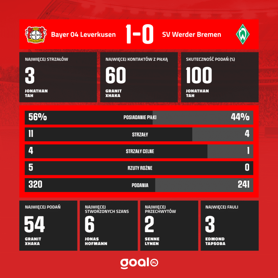 Victor Boniface znalazł niepilnowanego kolegę z drużyny. Xhaka nie zastanawiał się długo i huknął z dystansu, a piłka zatrzepotała w siatce. Podopieczni Xabiego Alonso trzymają już ręce na mistrzowskiej paterze.