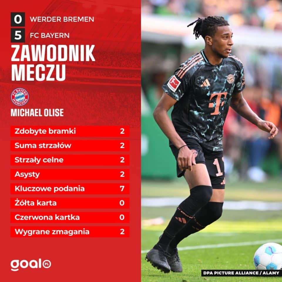 W tym meczu oglądaliśmy teatr jednego aktora. A mianowicie Michaela Olise. Francuski skrzydłowy popisał się wybitnym występem na Weserstadion. Wicemistrz Olimpijski bowiem zdołał tego dnia dwukrotnie wpisać się na listę strzelców, a także zaliczyć tyle samo asyst. Bez wątpienia były gracz Crystal Palace był najlepszym graczem meczu.