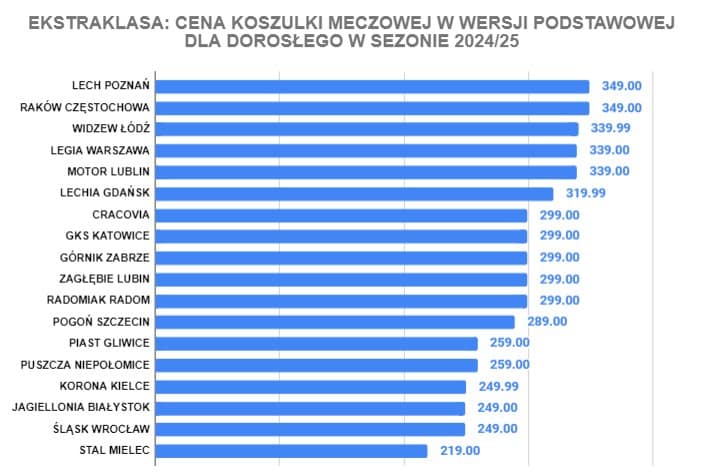 Najwięcej za koszulkę swojego klubu muszą zapłacić kibice Rakowa Częstochowa i Lecha Poznań, po 349 zł. Niewiele mniej kosztują stroje Widzewa Łódź, Legii Warszawa i Motoru Lublin (niecałe 340 zł). Ponad połowa klubów oferuje koszulki w wersji podstawowej poniżej 300 zł, a najtańsza Stal Mielec za 219 zł.