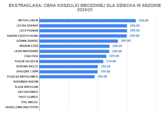 W tym zestawieniu ponownie wysoko znajduje się Motor Lublin, tym razem na niechlubnych szczycie z ceną przekraczającą 300 zł (jako jedyny w lidze). Ponad 250 zł trzeba zapłacić za koszulkę dla dziecka Lechii Gdańsk, Lecha Poznań, Rakowa Częstochowa i Górnika Zabrze. Najmniej zapłacimy w sklepie Puszczy Niepołomice, niecałe 190 zł.