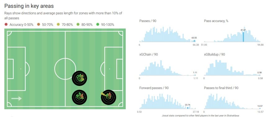 - pod kątem liczby prostopadłych podań Josue jest pierwszy (49) pod kątem podań w ofensywną tercję boiska jest drugi (255, lepszy tylko Dąbrowski)