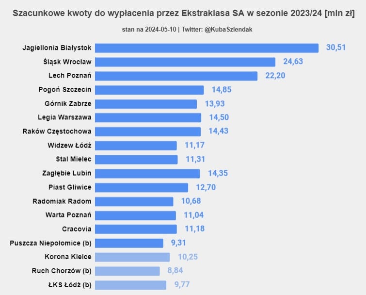 Oczywiście o największe kwoty rywalizuje Jagiellonia Białystok i Śląsk Wrocław. Wrocławianie przy najkorzystniejszym wyniku otrzymają o 16 mln zł więcej niż w przypadku zrealizowania najgorszego scenariusza, jakim byłoby zajęcie 6. miejsca w ligowej tabeli.