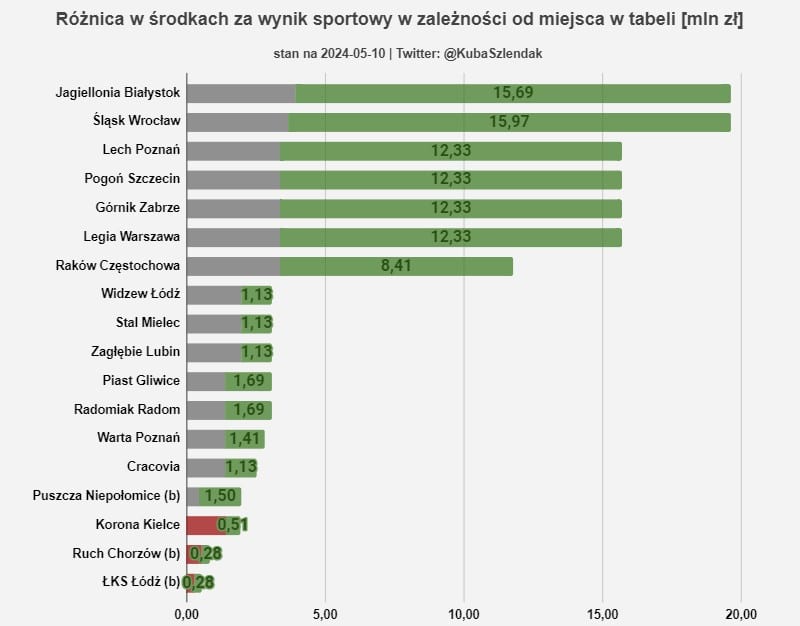W tym miejscu muszę powołać się na obliczenia powszechnie znanego i szanowanego użytkownika Twittera – Piotra Klimka. Jego obliczenia pozwoliły na przeprowadzenie ćwiczenia, w którym policzyłem ile wynosi różnica w premii za wynik sportowy między najlepszym a najgorszym miejscem, które może zająć dany zespół.