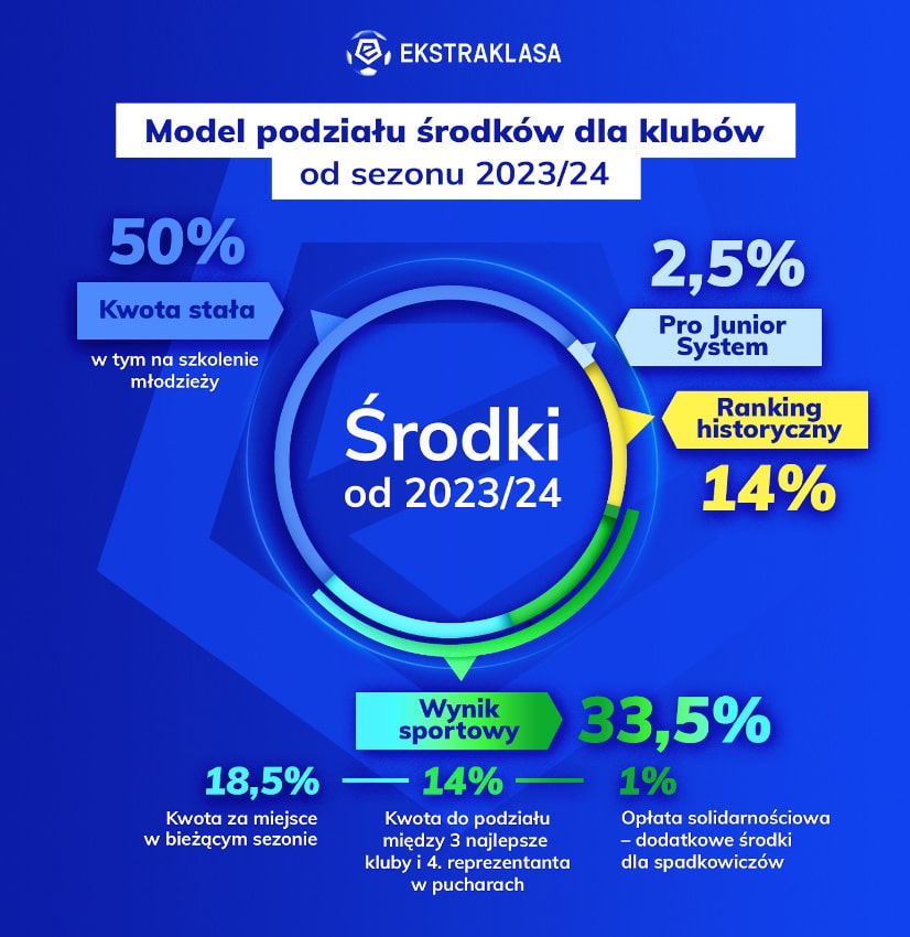 - 50% (wcześniej 44%) to kwota równo dzielona na każdy z 18 zespołów, jest to tak zwana “kwota stała”, w tym sezonie wyniesie ok. 7.2 mln zł