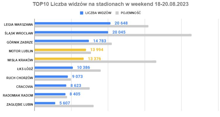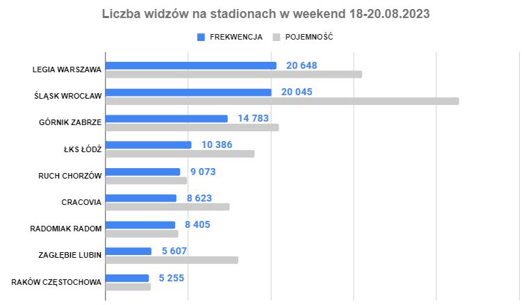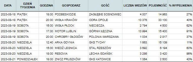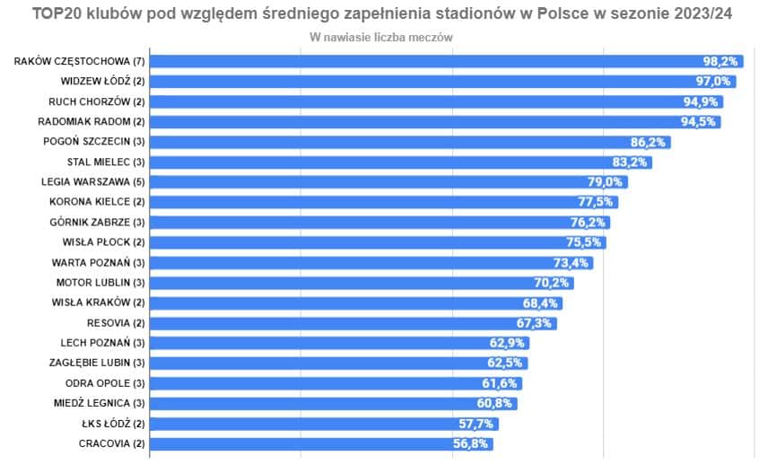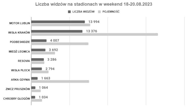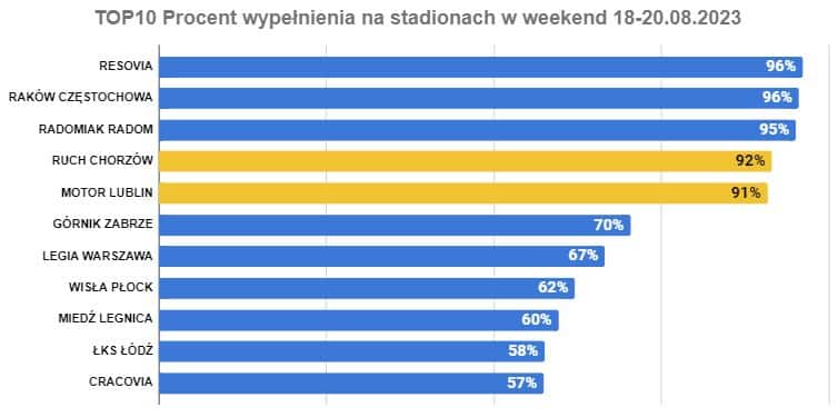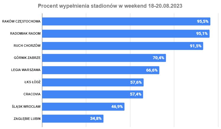 Stadiony Rakowa, Radomiaka i gliwicki dom Ruchu Chorzów z wypełnieniem wyższym niż 90%. Areny w Zabrzu i Warszawie w okolicach 70% i dwa dolnośląskie stadiony z zapełnieniem niższym niż 50%. Szczególnie uwagę zwraca ten w Lubinie, który jest o wiele mniejszy niż Tarczyński Arena we Wrocławiu.