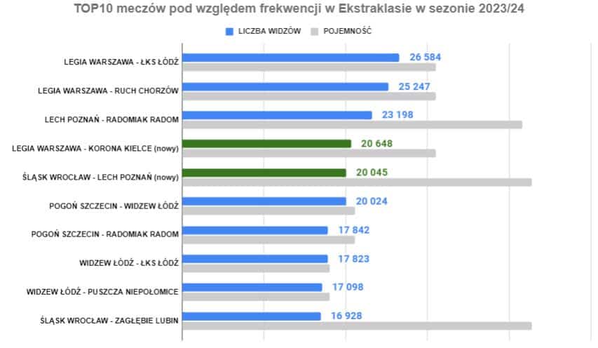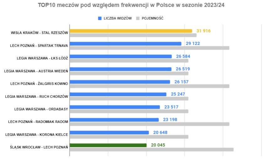 Patrząc na sezon jako całość, widzimy świetne liczby Legii Warszawa (3 mecze w TOP4 całej ligi) oraz mobilizację we Wrocławiu, gdzie na obu meczach Śląska było prawie 37 tys. kibiców. W TOP10 znajdują się mecze tylko 5 klubów, a konkretnie 3 spotkania Legii, po dwa Pogoni, Śląska i Widzewa oraz jedyny domowy mecz w tym sezonie ligowym Lecha Poznań.