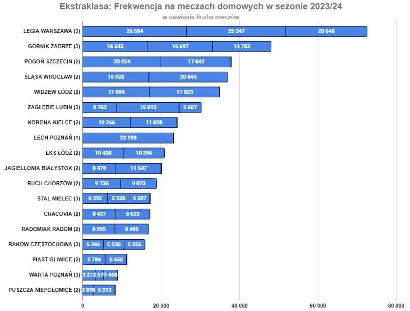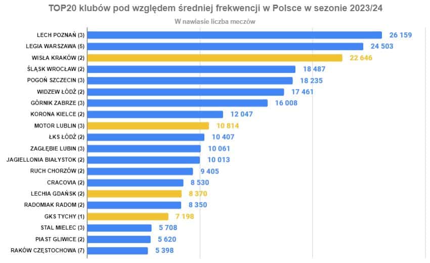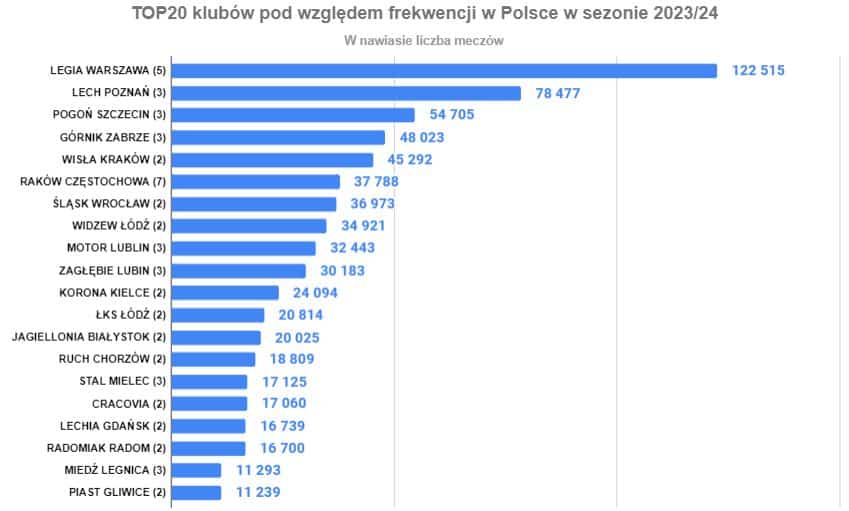 Analiza łącznej liczby osób, które odwiedziły polskie stadiony jest problematyczna z uwagi na różną liczbę meczów, które gościły na poszczególnych arenach. Raków Częstochowa zorganizował w tym sezonie aż 7 meczów, podczas gdy Wisła Kraków czy Śląsk Wrocław tylko po dwa.