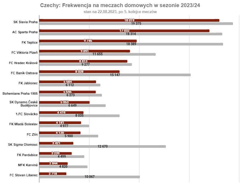 W lidze czeskiej tak jak w Polsce przeprowadzono pięć ligowych kolejek. Najlepszą frekwencją mogą pochwalić się praskie kluby – Slavia i Sparta, które notują wyniki w wysokości ponad 15 tys. widzów. Odnosząc ten wynik do Ekstraklasy mamy mniej więcej takie liczby jak w przypadku Pogoni Szczecin i Śląska Wrocław. Kolejne w zestawieniu Teplice i Viktoria Pilzno z wynikiem ok. 9 tys. kibiców to podobny wynik do Ruchu Chorzów i Cracovii, ale gorszy niż Korona, ŁKS Łódź czy Jagiellonia. Ogólna średnia frekwencja to 7 tys. widzów w porównaniu do 11 706 w Ekstraklasie.