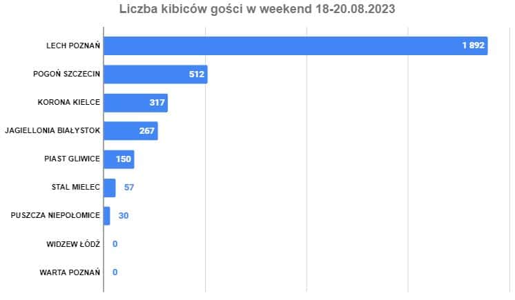 Poniższy wykres to odpowiedź na pytanie: “Ilu kibiców gości było na stadionach?”. W ostatniej kolejce zdecydowanie najlepszych wyjazdem był ten kibiców Lecha na Dolny Śląsk. Było ich więcej niż wszystkich wyjazdowych ekip razem wziętych. Tylko Pogoń i Lech przekroczyły 500 osób w grupie wyjazdowej.